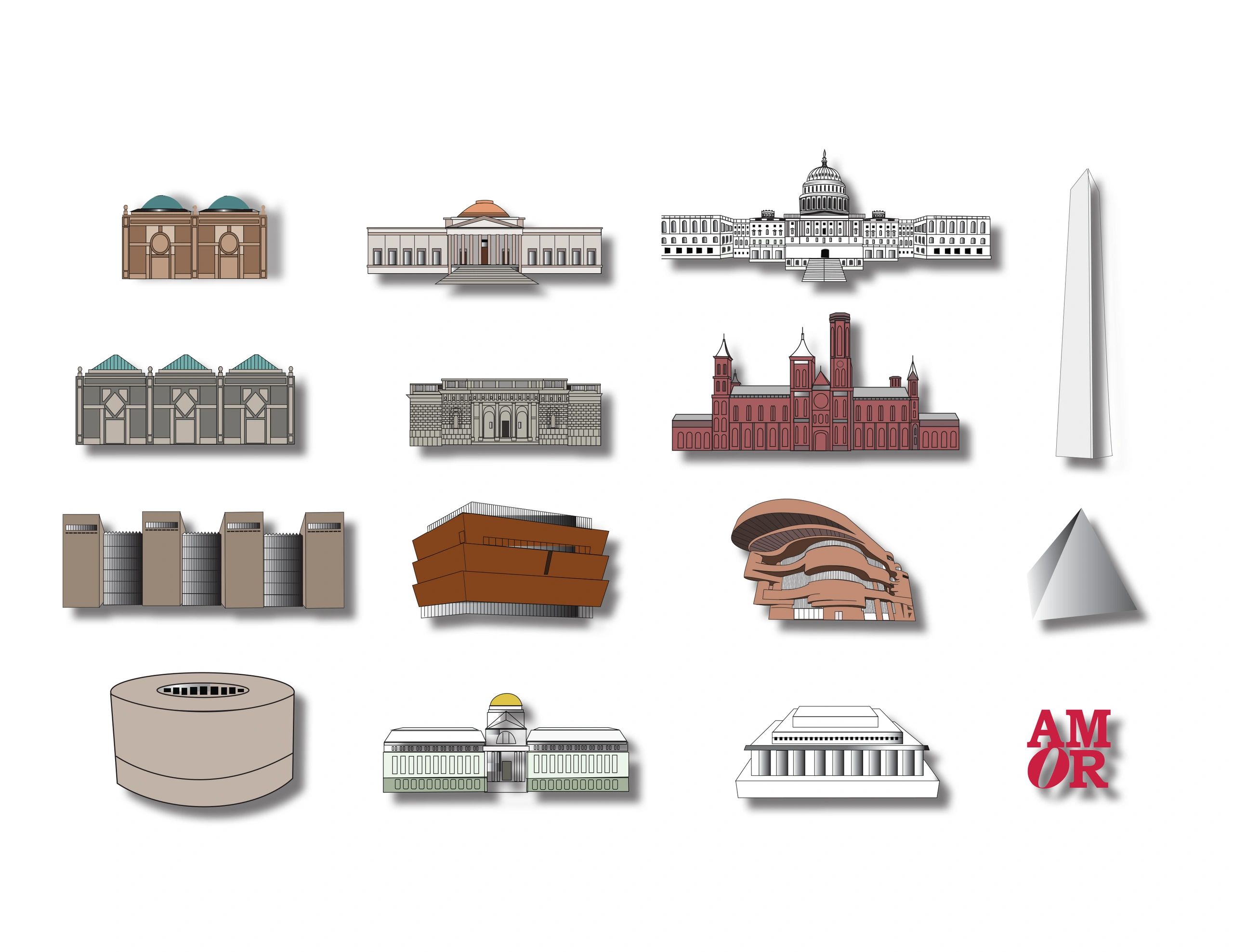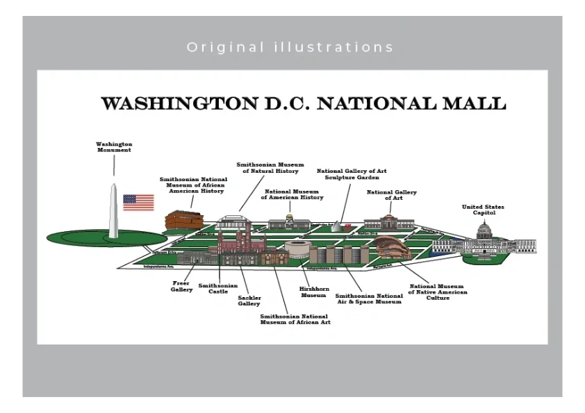 Map of the DC National Mall using building illustrations created in Adobe Illustrator.